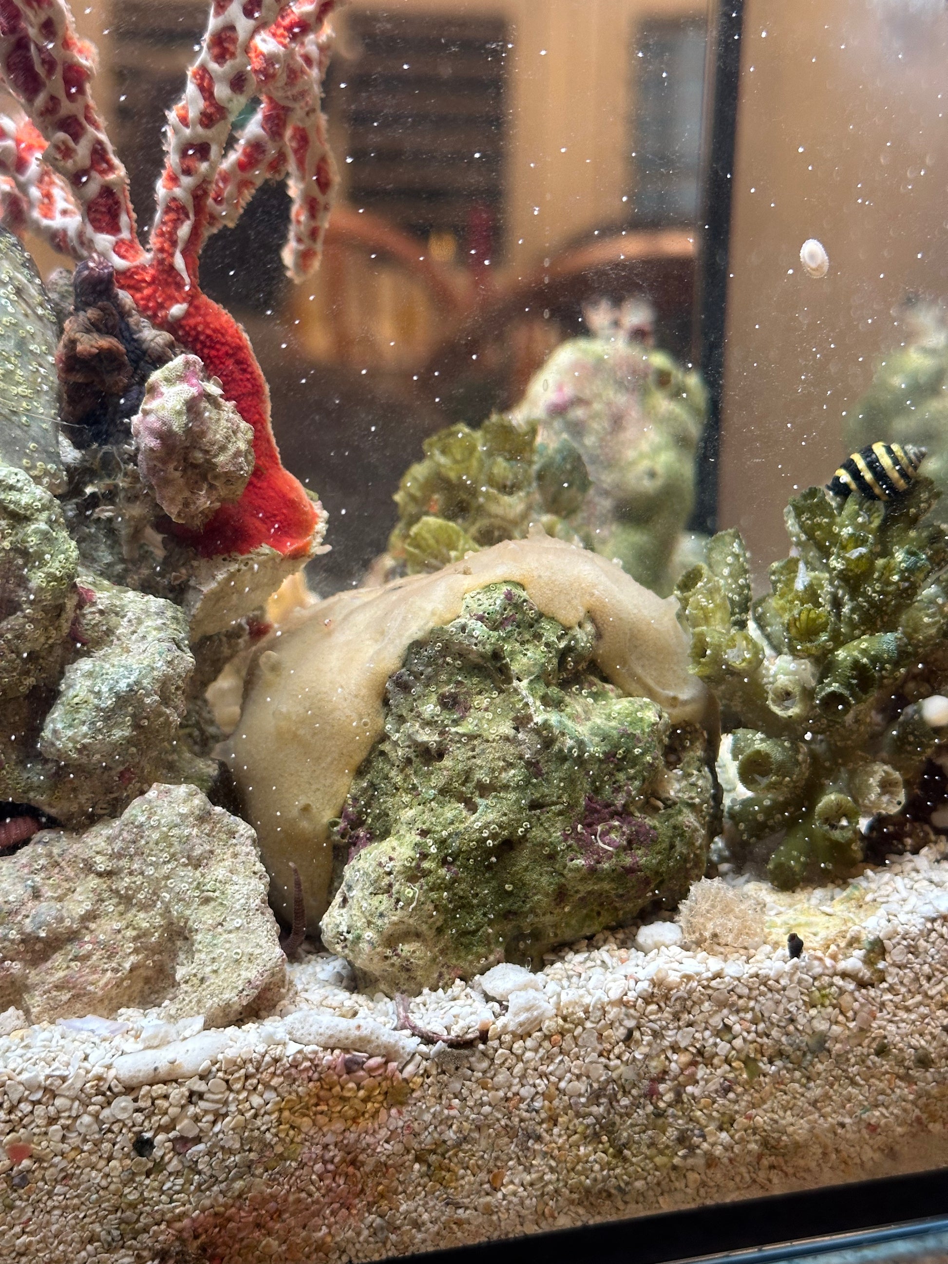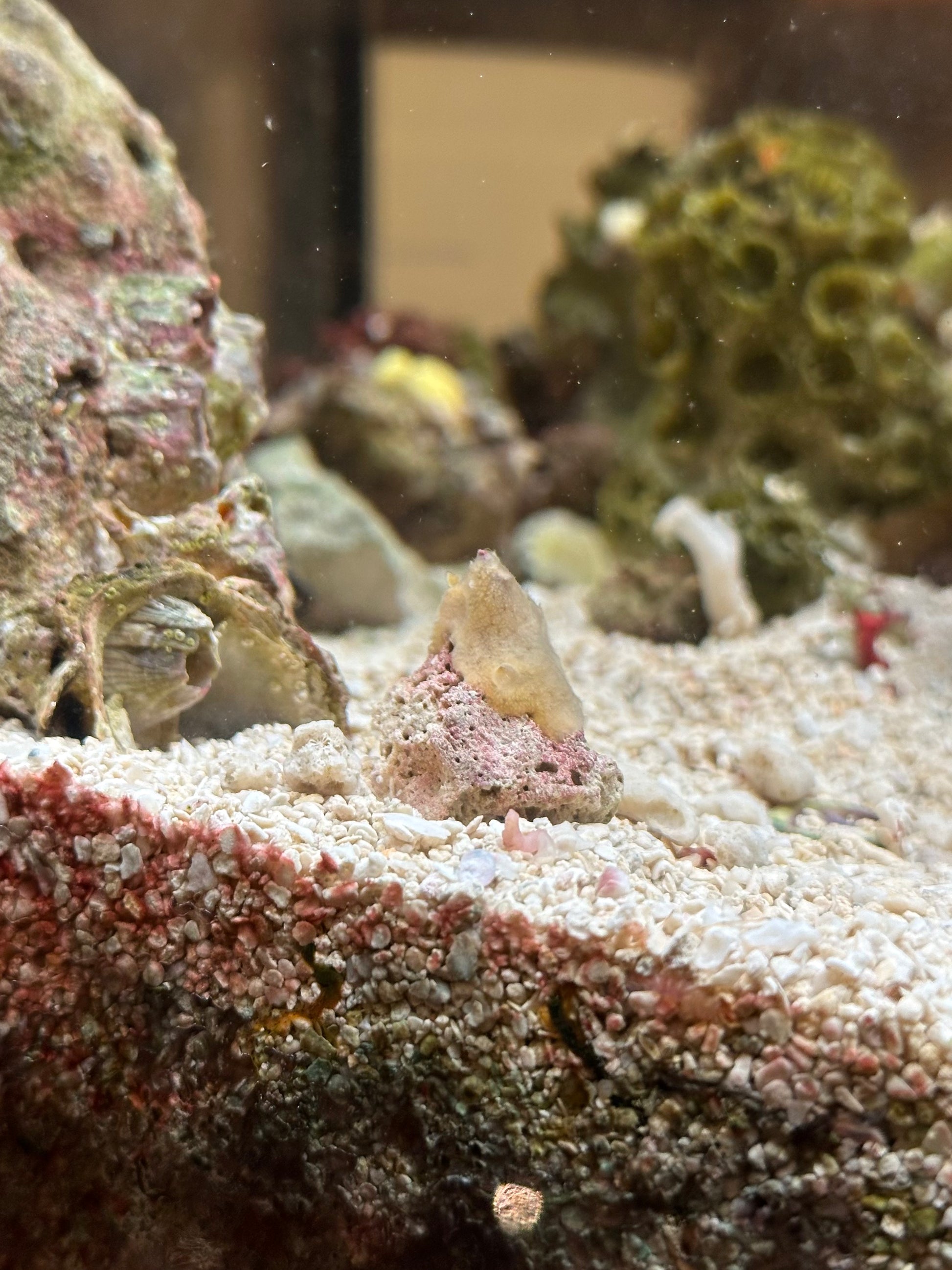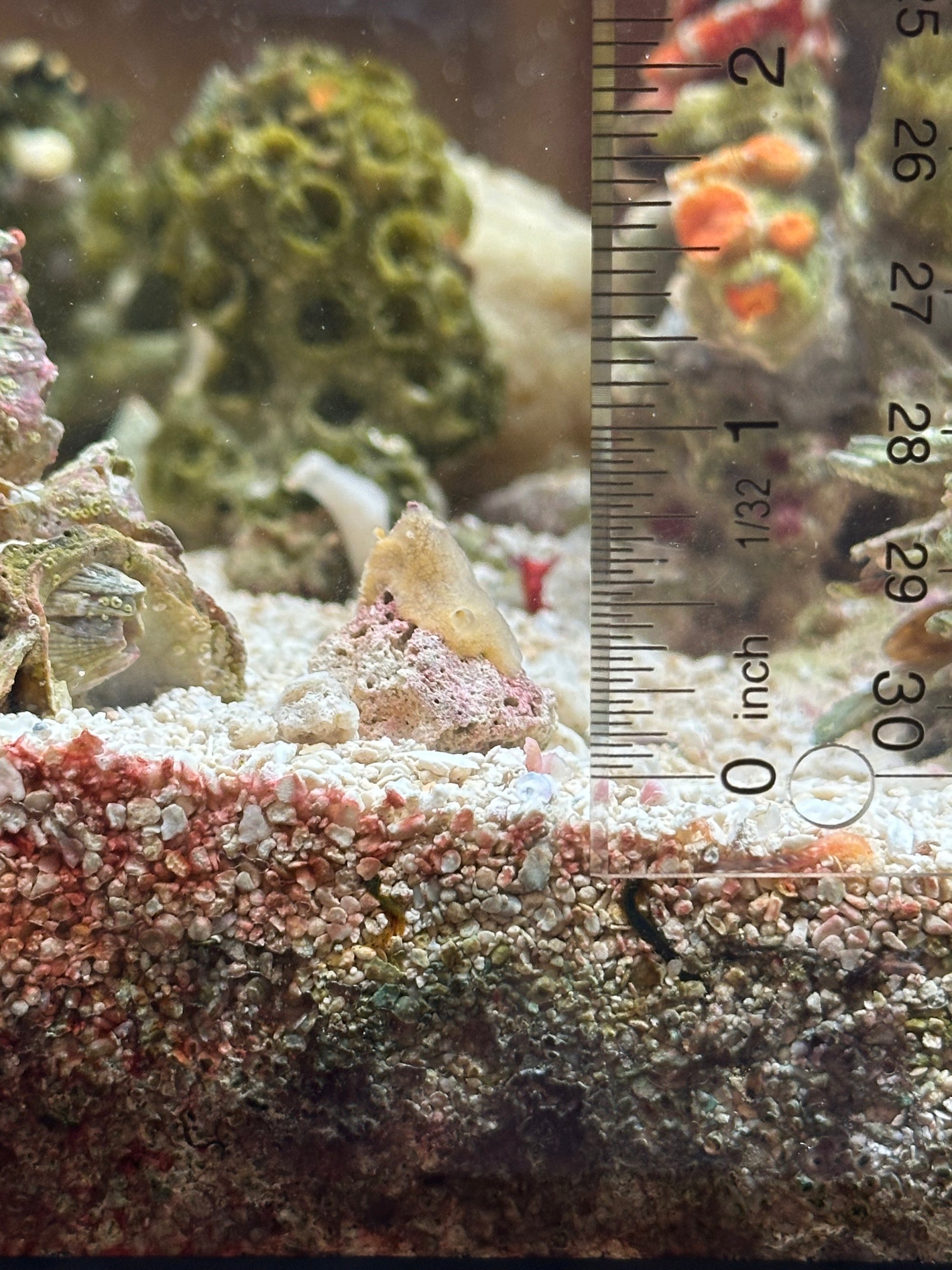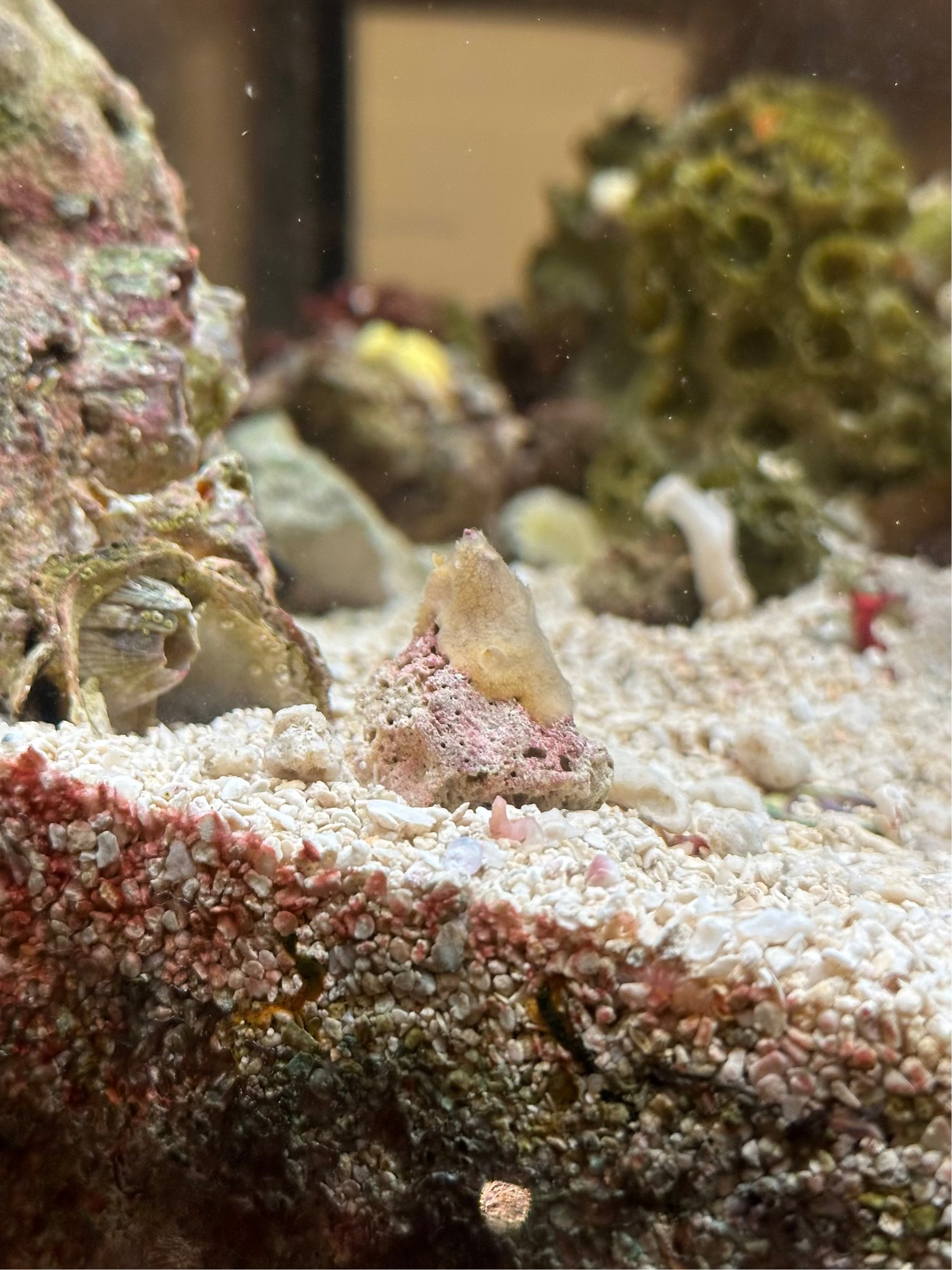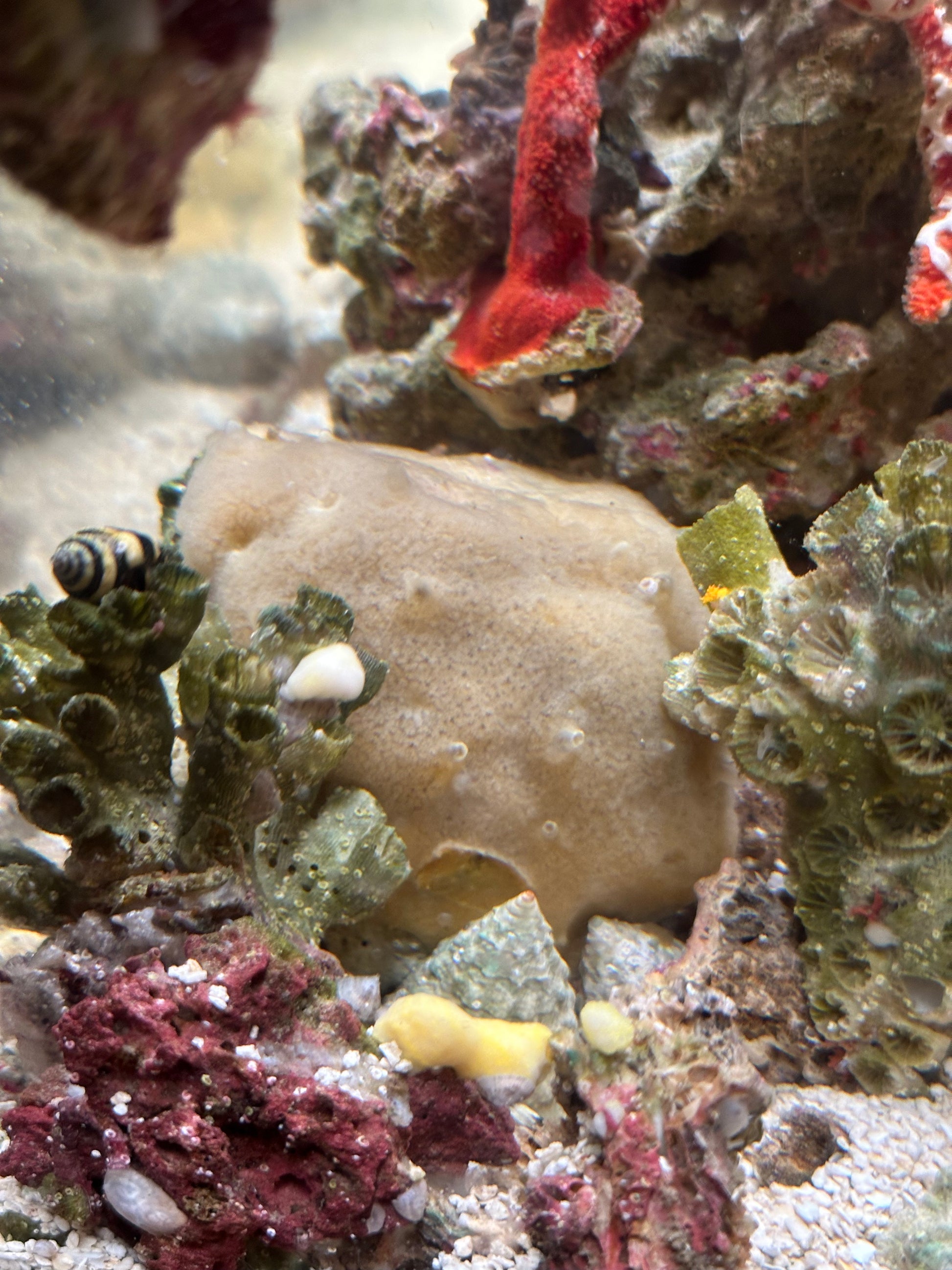Beautiful cream colored sponge attached to live rock or shell. This is a non-photosynthetic encrusting variety, the mother colony is pictured in the last two photos. It has been a very quick grower for us!